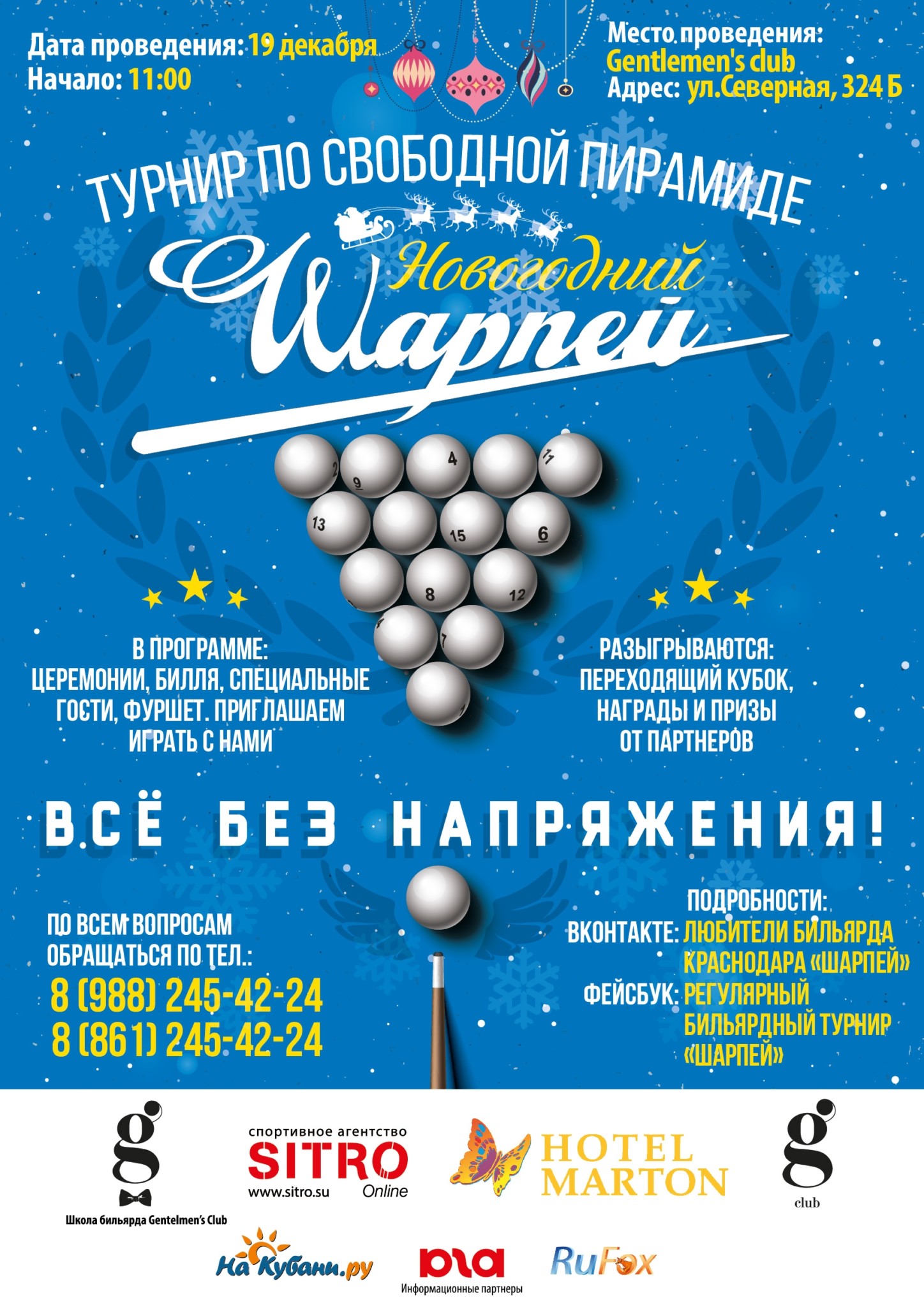 В программе праздничного новогоднего бильярдного мероприятия участников ожидает: великолепная игровая атмосфера, церемонии, мастер-класс, бильярдные фокусы, билля, фуршет, сюрпризы, призы и музыка. Вход для представителей СМИ – свободный, участие любителей в турнире, только по предварительной регистрации и клубным картам.