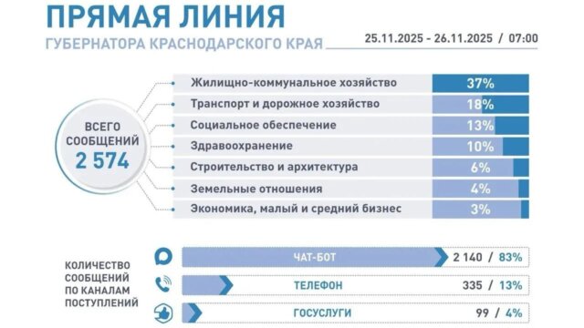 Жители Краснодарского края активно используют различные каналы для обращения к властям. Наиболее популярным способом связи стал чат-бот в мессенджере MAX, через который поступило 63% всех сообщений. 29% обращений поступили по телефону центра обработки сообщений, а 8% — через платформу обратной связи на портале «Госуслуги».