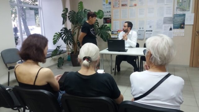 Еще один формат работы с пожилыми -лекции. Одну из них провёл врач высшей категории, кардиолог/терапевт Иван Герасименко. Он рассказал о мерах по профилактике гипертонии. А его коллега — врач первой категории, невролог Полина Маслова затронула тему профилактики инсульта.