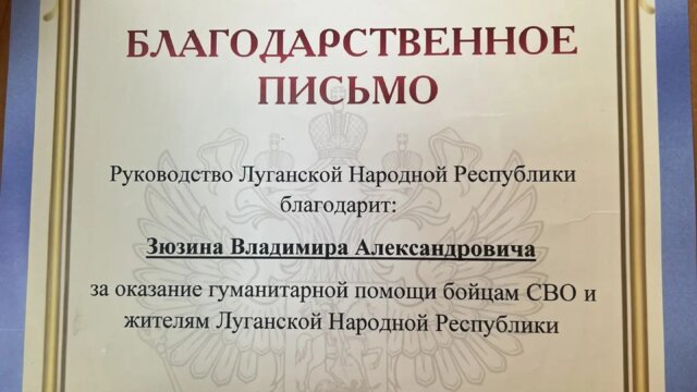 Глава Луганской народной республики Леонид Пасечник направил Благодарственное письмо депутату ЗСК Владимиру Зюзину за оказание гуманитарной помощи бойцам СВО и жителям ЛНР.