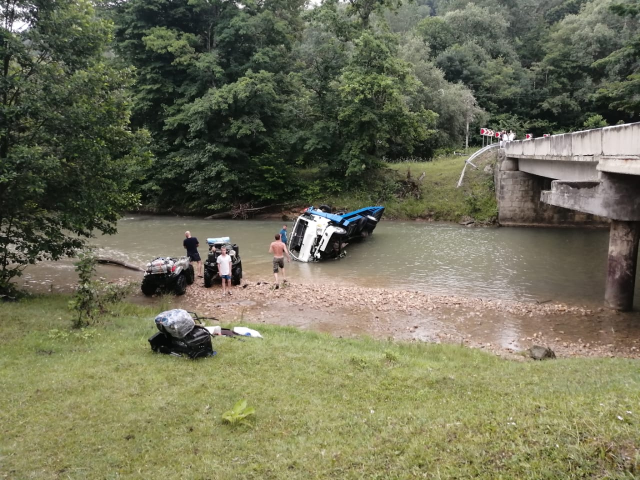 Эвакуатора Hyundai, перевозивший четыре квадроцикла, не вписался в поворот. На вираже водитель транспортного средства не справился с управлением. Эвакуатор сбил металлическое ограждение перед мостом и съехал в русло реки Курджипс.