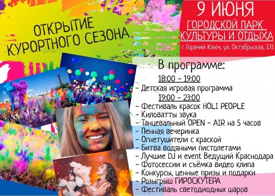 Открытие курортного сезона-2018 стартует в 18-00 развлекательной программой для самых маленьких. Ее продолжит фестиваль красок «Holi People» и пенная вечеринка.