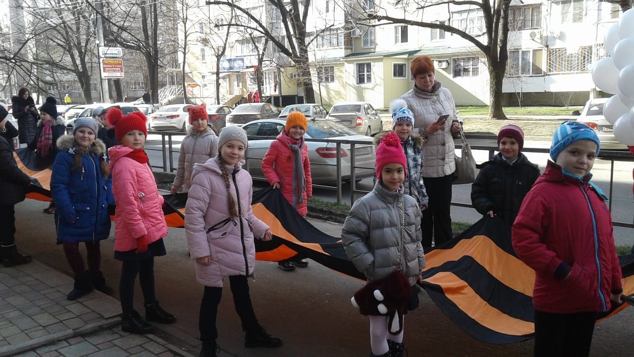 Ребята принесли к подножию памятника огромного размера георгиевскую ленту. Они почтили память тех, кто ценой свой жизни освободил родной город от врага.