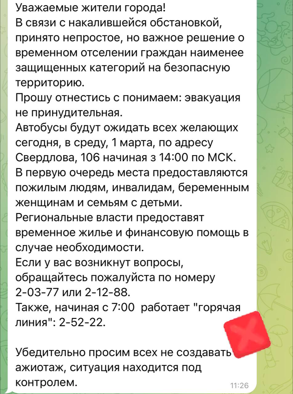 Глава Ейского района Роман Бублик вновь опровергает слухи о том, что происходит в муниципалитете. Так, по информации, тиражируемой в социальных сетях, из района планировалось в добровольном порядке эвакуировать «наименее защищённые группы граждан». Публикации с соответствующим текстом появлялись в чатах Ейского района, а также отправлялись жителям в виде рассылок.