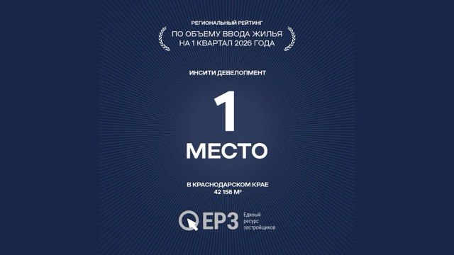 Компания ИНСИТИ девелопмент по итогам 1 квартала 2026 года заняла первую строку регионального рейтинга по объемам ввода жилья в Краснодарском крае по версии Единого ресурса застройщиков.
