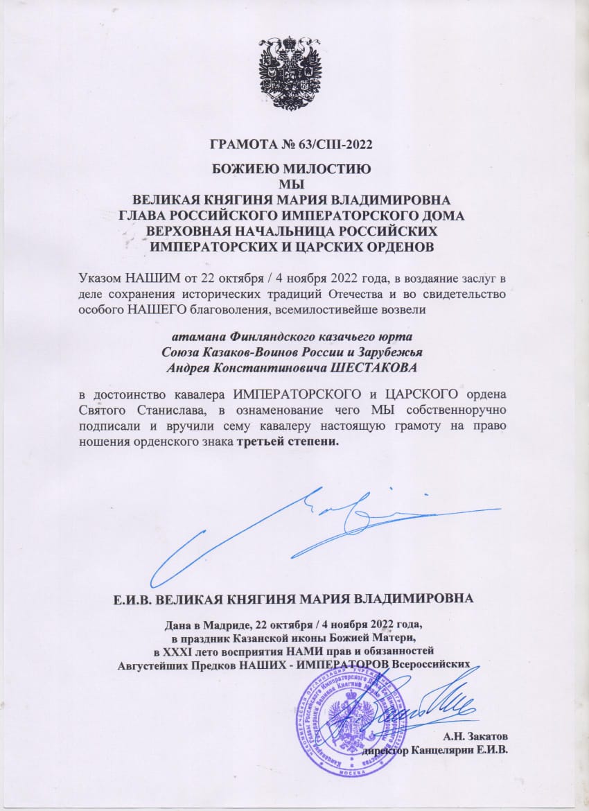 — Да. В прошлом году награжден Императорским и Царским орденом Святого Станислава III степени за личной подписью великой княгини Марии Владимировны Романовой по рекомендации барона фон Витте.