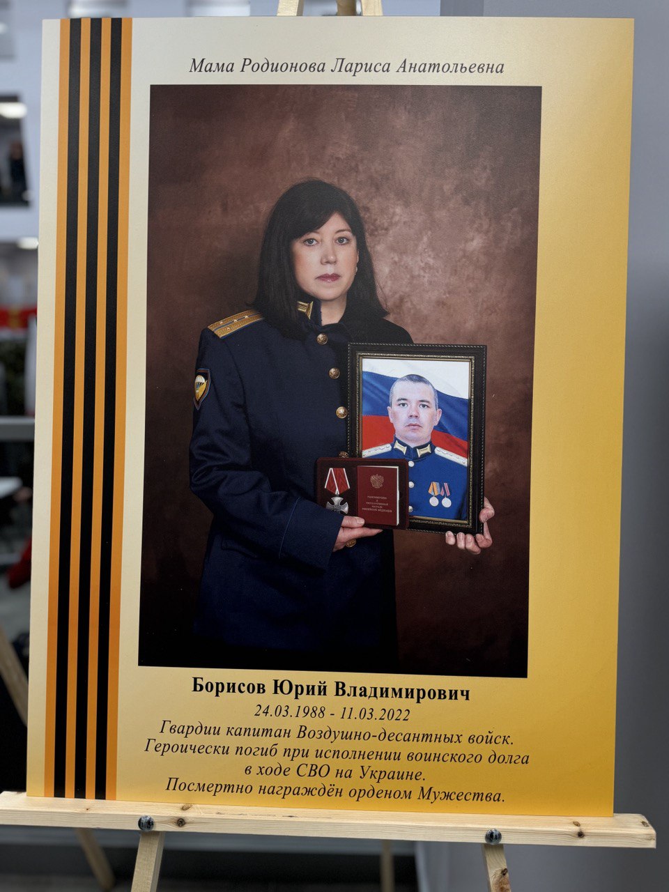 Среди фотоэкспозиций героев были представлены и снимки погибшего Юрия Борисова, который жил в 38-м избирательном округе Краснодара. В память о нем в этом году депутат городской Думы Краснодара Андрей Арендаренко планирует установить мемориальную доску в СОШ №47, где обучался герой.