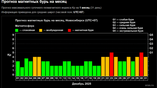 С 20 декабря ситуация начнёт ухудшаться. В конце месяца, 23 и 30 декабря, ожидаются две магнитные бури класса G1, которые могут повлиять на работу спутников, систем связи и даже на здоровье людей, чувствительных к изменениям магнитного поля. В остальные дни декабря магнитосфера будет оставаться в состоянии возбуждения, что также может вызвать различные геомагнитные явления.
