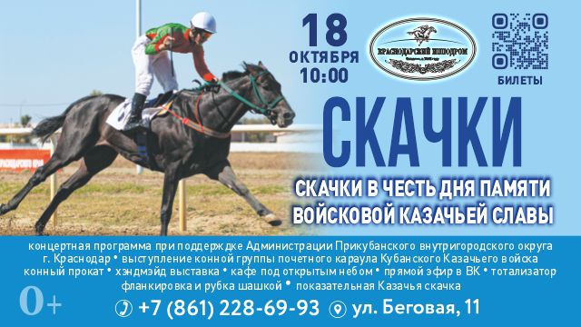 В субботу, 18 октября, на Краснодарском ипподроме состоятся скачки в честь в честь Дня Памяти войсковой Казачьей славы. Будут разыграны призы для жеребцов и кобыл 2-х лет и старше, чистокровной верховой и арабской пород на дистанции от 1200 до 3200 метров.