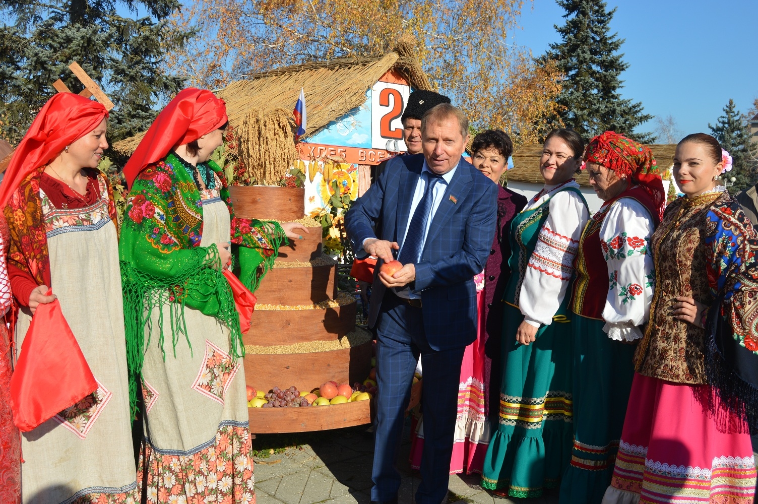 Но вот подведены итоги смотра-конкурса куреней, отведаны угощения, и народ потянулся в Дом культуры. Победителям в различных номинациях по итогам уборки в растениеводстве отведены первые два ряда в зрительном зале. Горят золотом на красном слова «герой жатвы», звучат фанфары, на сцене, украшенной караваем, появляется ведущая праздничного мероприятия. Принять хлеб-соль на сцену приглашают директора хозяйства, ежегодно в полной мере разделяющего все тяготы уборочной кампании Сергея Владимировича Кизинька. Он же открывает праздничную программу.