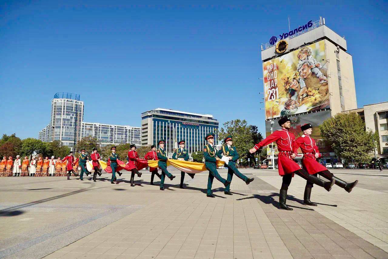 По словам краснодарцев, праздник в честь родного города они запомнят как самый яркий день года. По традиции начался он с поднятия флага Краснодара на Главной городской площади. Под звуки гимна Краснодара в исполнении ансамбля «Кубанская казачья вольница имени Н. В. Кубаря» почетный караул Кубанского казачьего войска и представители Поста №1 пронесли флаг по площади и подняли его на флагшток.