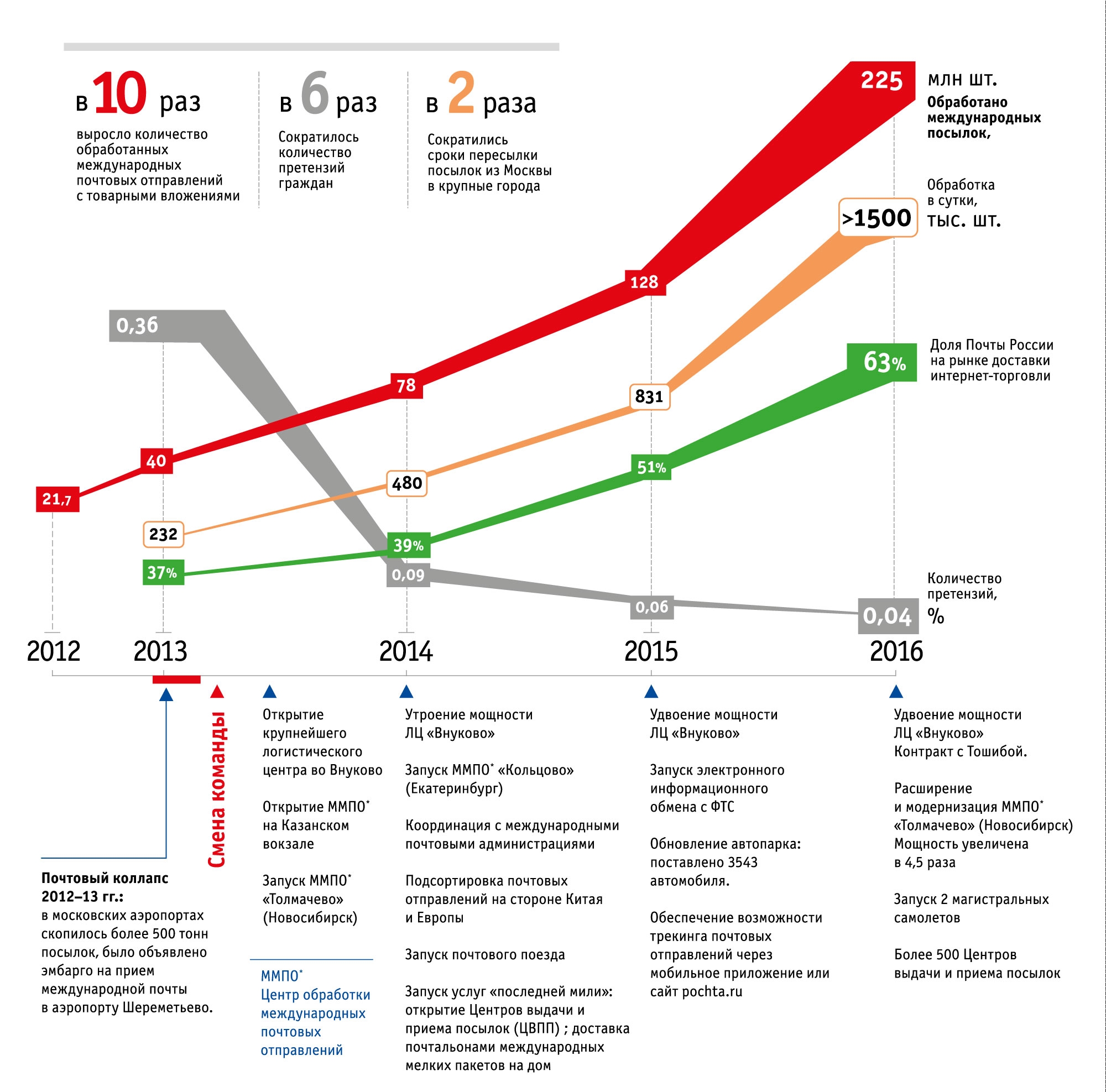 «Почта России четвертый год подряд ставит рекорды по обработке международных отправлений. Среднесуточный трафик в декабре этого года составил более 1,5 млн отправлений, в то время как до прихода новой команды в 2013 году менее 50 тысяч отправлений в день стали причиной известного коллапса, – отметил генеральный директор Почты России Дмитрий Страшнов. – В целом за 2016 год было обработано более 225 млн международных отправлений с товарными вложениями, что почти в 2 раза превышает показатель прошлого года (128 млн отправлений) и более чем в 10 раз – показатель 2012 года (21,7 млн отправлений). Объем почтового экспорта увеличился на треть по сравнению с 2015 годом».