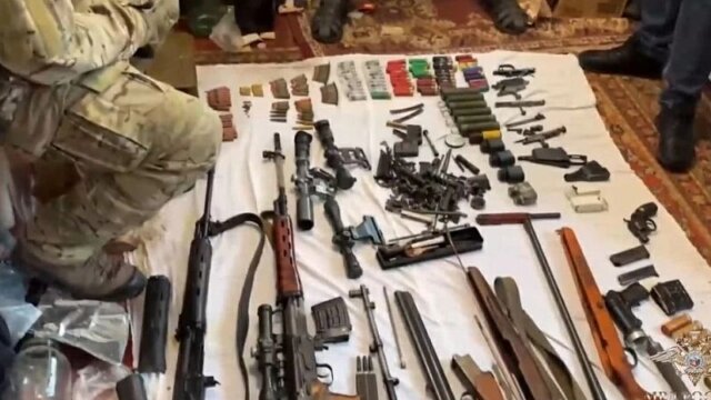 Во время обысков найдены пистолеты, приборы для бесшумной стрельбы и ночного видения, другое оружие, а также свыше 10 тысяч боеприпасов, а еще гранаты и взрывчатые вещества.