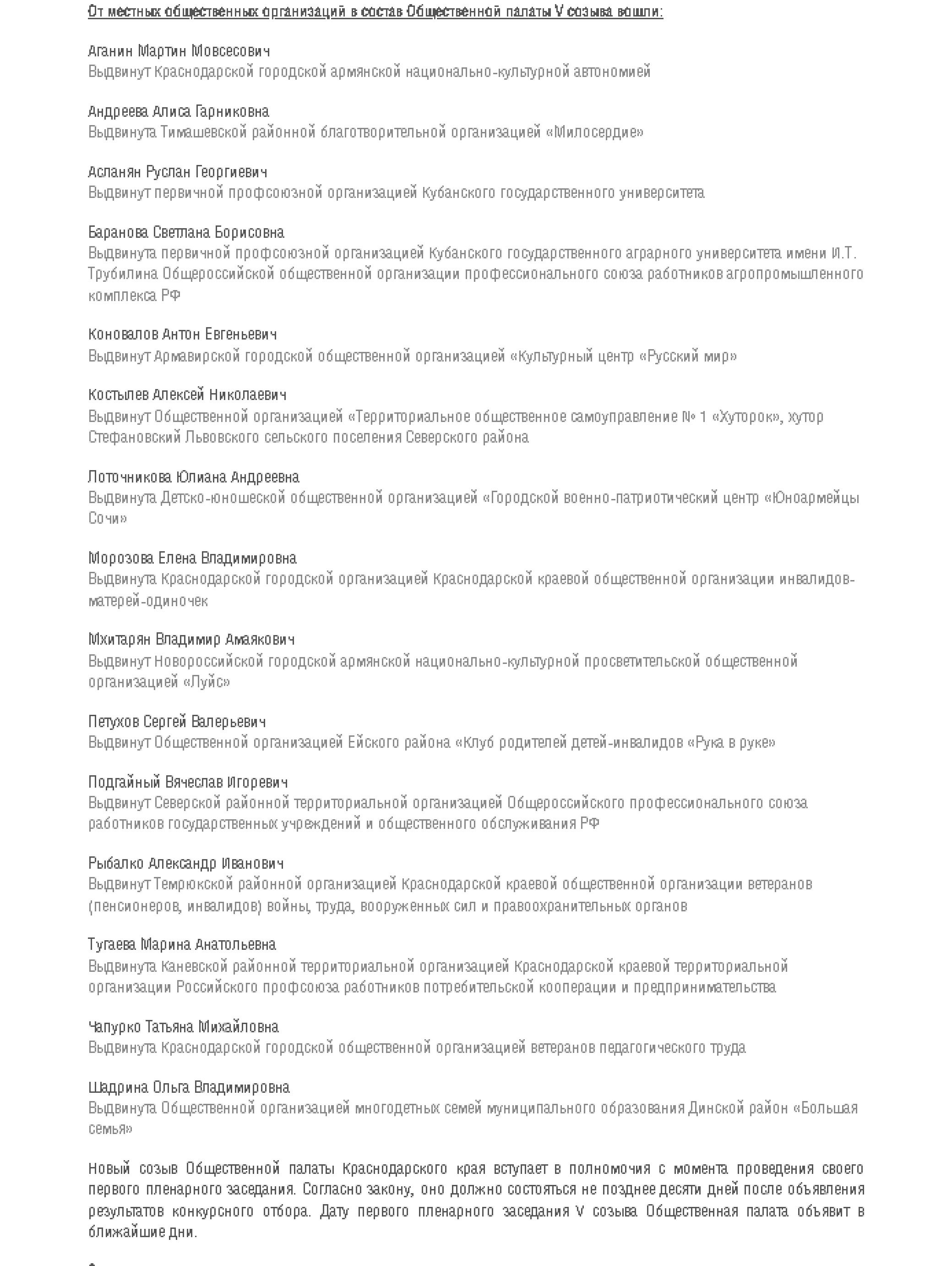 Напомним, в состав общественной палаты нашего края входят 45 человек, треть из которых определяется из числа кандидатов, выдвинутых действующими на Кубани российскими общественными объединениями и утверждается губернатором региона.