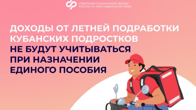 Отделение СФР по Краснодарскому краю напоминает, что с 1 июня 2024 года при оценке доходов семьи при назначении единого пособия не учитываются доходы от трудовой деятельности подростков до 18 лет, если они не менее 6 месяцев расчетного периода учились в школе, ссузе или вузе по очной форме.