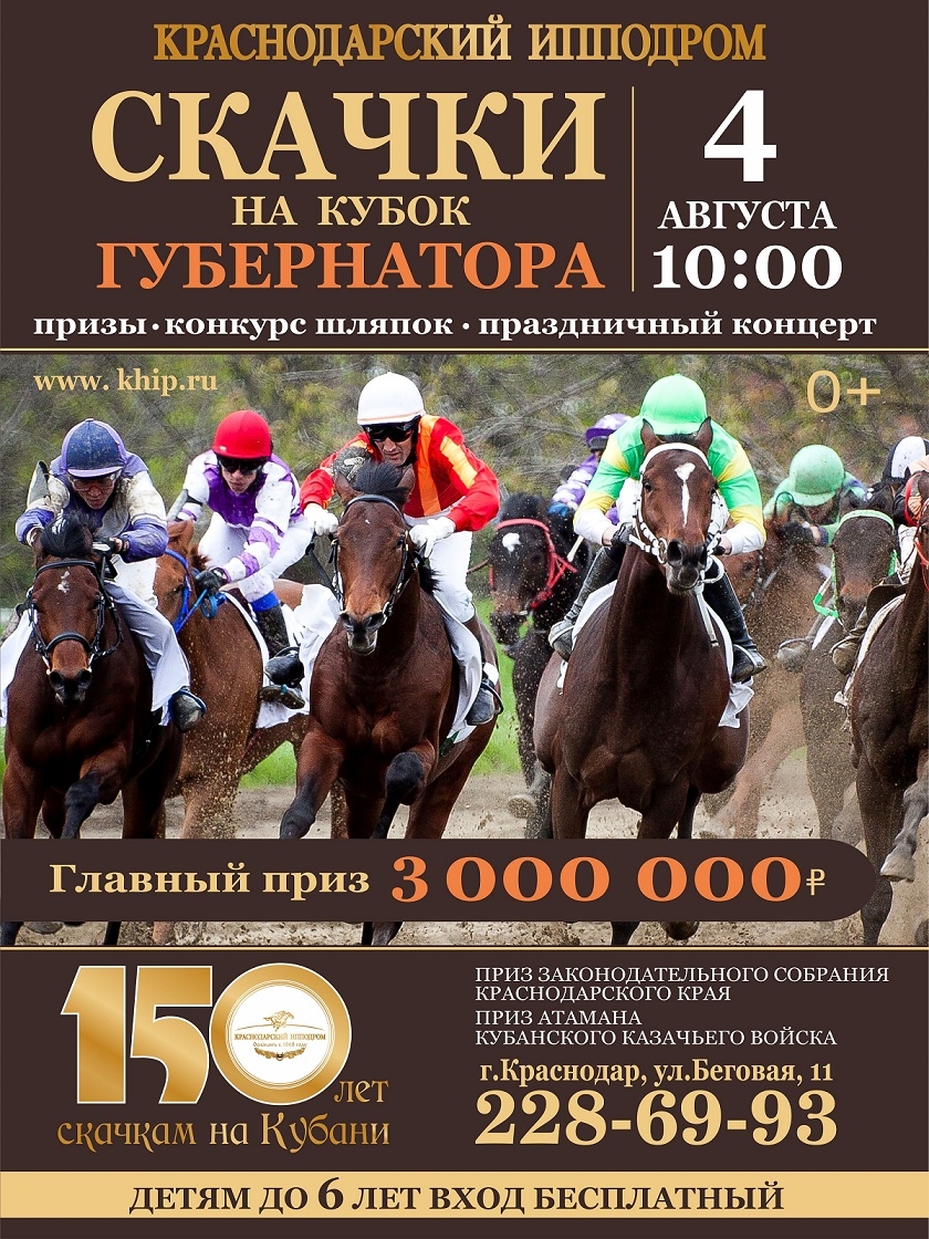 4 августа в 10 часов на Краснодарском ипподроме состоится Главное событие Кубанского скакового сезона — скачки на Кубок Губернатора Краснодарского края!