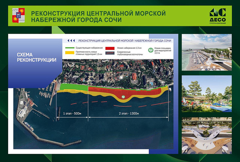 Берег на очередном этапе работ укрепят на протяжении 1 300 метров. Также планируется расширить пляж, обновление набережной с прогулочной зоной и создание событийной площадки на 20 000 мест. Также не всей протяжённости новой досуговой зоны установят малые архитектурные формы, игровые и спортивные площадки.