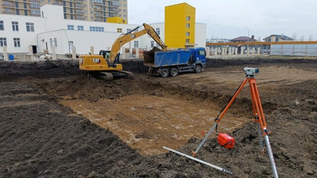 На первоначальном этапе специалисты начали выравнивать площадку и рыть котлован для закладки фундамента, а после приступят к монолитным работам.