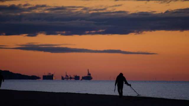 man with metal detector in the morning, on the beach with orange sky