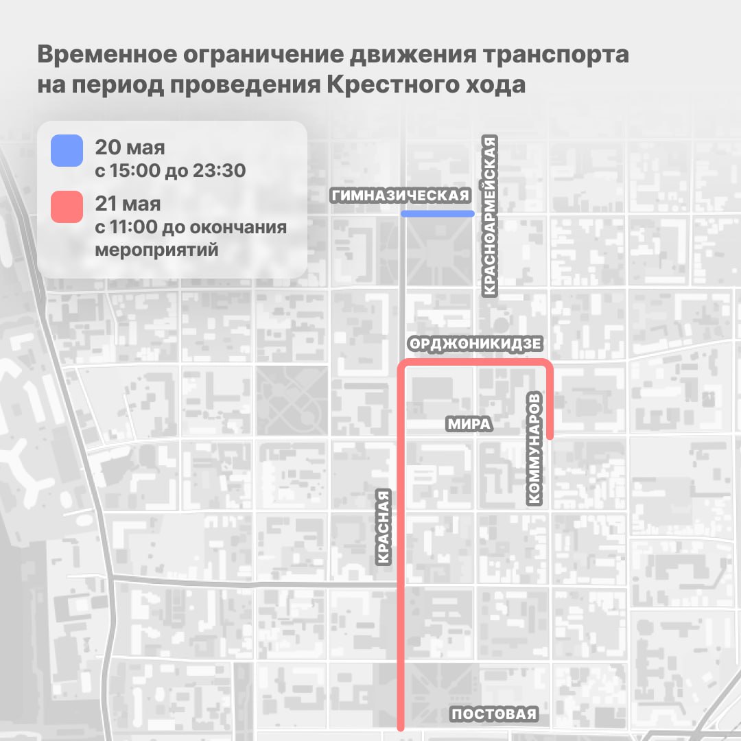 21 мая с 11 часов утра до окончания мероприятия аналогичные меры будут введены перед Свято-Екатерининским собором — на улице Коммунаров (от улицы Мира до Орджоникидзе), а также на улицах Орджоникидзе (от Коммунаров до Красной) и Красной (от Орджоникидзе до Постовой). От припаркованного транспорта названные участки, а также территории, прилегающие к Войсковому собору святого благоверного князя Александра Невского, освободят начиная с 6 часов утра 21 мая.