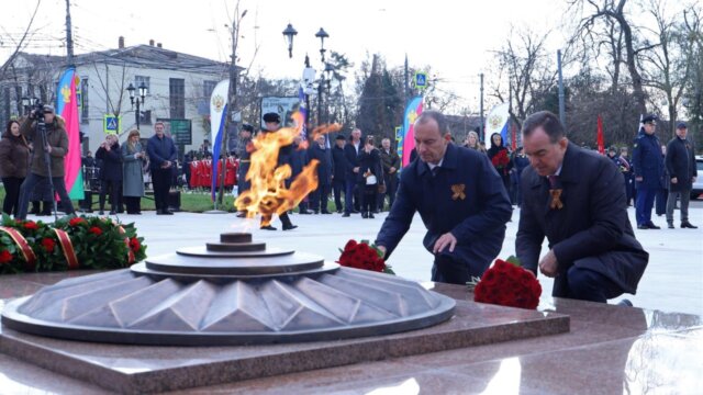 Затем участники возложили цветы к мемориалу. Завершилось мероприятие прохождением войск Краснодарского гарнизона и казаков Почетного караула Кубанского казачьего войска.