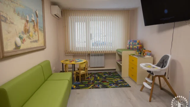 В комнате предусмотрены все необходимые удобства: отдельная зона для гигиенических процедур, уборная, душевая и игровая зона. Это позволяет родителям не только заботиться о своем ребенке, но и поддерживать его активность и развитие в игровой форме. Пространство организовано таким образом, чтобы максимально упростить жизнь молодым семьям, обеспечивая им все необходимое для комфортного пребывания.