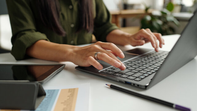 Hand of young female teacher or student typing on laptop keyboard while sitting by desk in front of camera and answering task questions