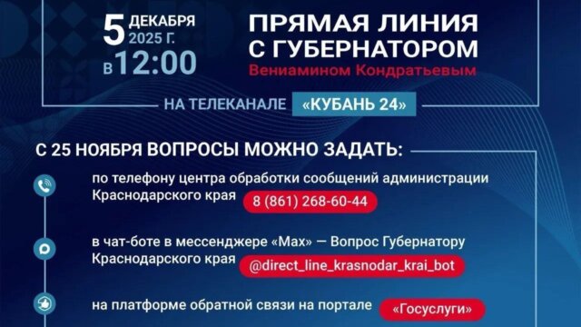 Вениамин Кондратьев традиционно общается с гражданами в прямом эфире телеканала «Кубань 24». Это отличная возможность для жителей края напрямую обратиться к своему губернатору и обсудить волнующие их темы. В этом году «Прямая линия» также пройдет в формате открытого диалога, где каждый сможет получить ответ на свой вопрос.