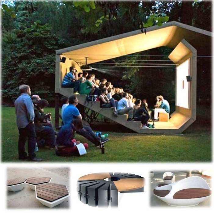 На картинке: небольшие летние кинотеатры и оригинального дизайна скамейки могут быть полезны в городских парках и зонах отдыха, особенно если принять во внимание, что изготавливаются подобные изделия из того, что отправляется на свалки.