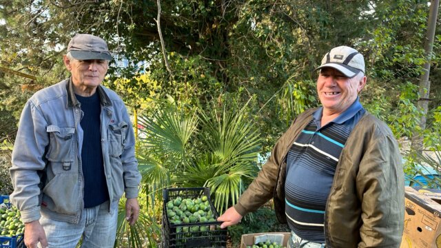 — Фейхоа — это не яблоко и не груша. Плоды не срывают с ветки, а собирают с земли. Если ягода упала, значит, она созрела. Сегодня начали в девять утра, сейчас двенадцать, уже тридцать ящиков по десять килограммов есть,— рассказывает сборщик Табрис Сулейманов.